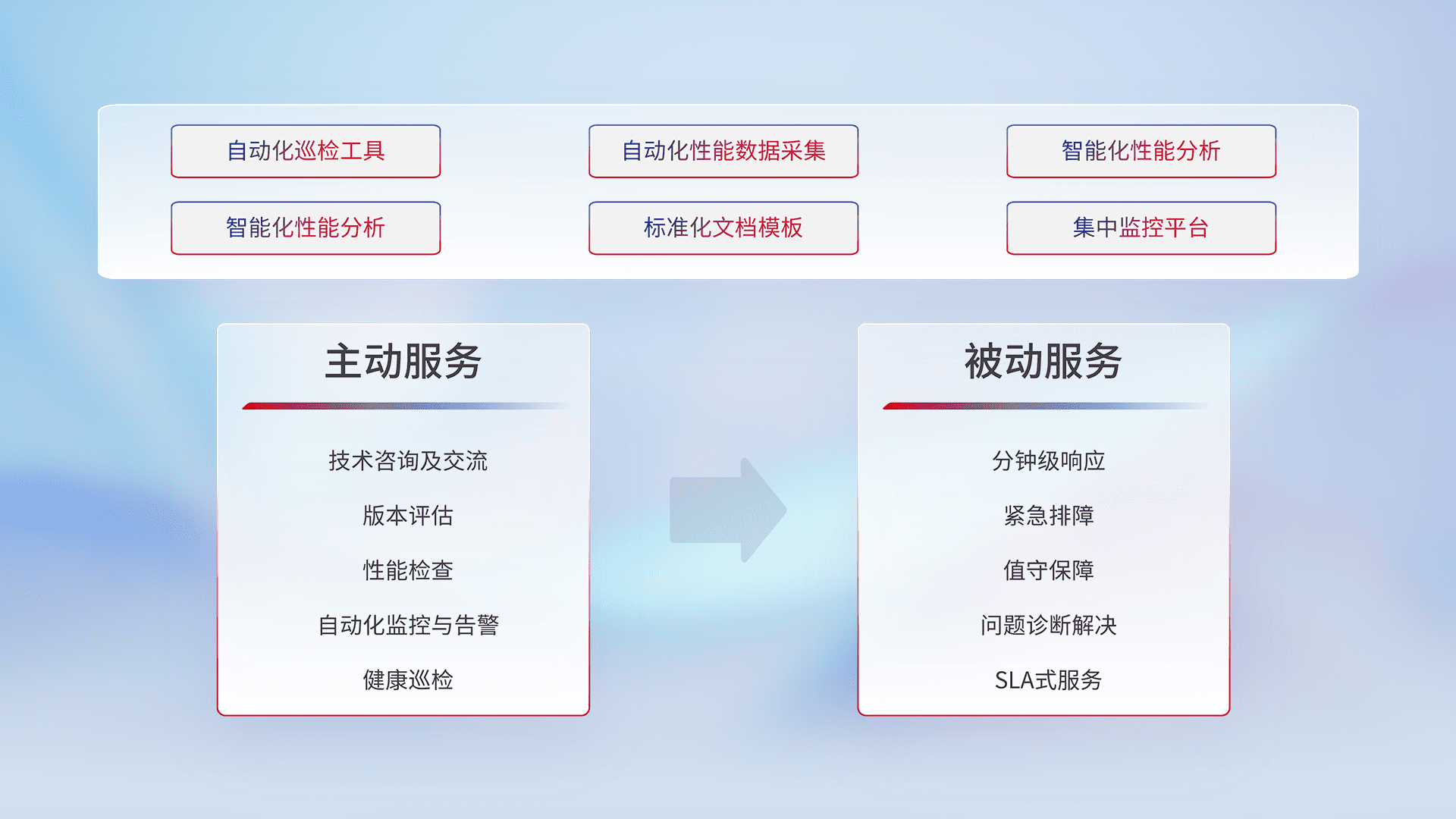智能化工具和标准化文档,,保障服务质量,,提供主动服务(包含技术咨询、、、版本评估、、、性能检查、、自动化监控与告警、、、健康巡检)和被动服务包含(分钟级响应、、、紧急排障、、、、值守保障、、、问题诊断解决、、、SLA服务)。。